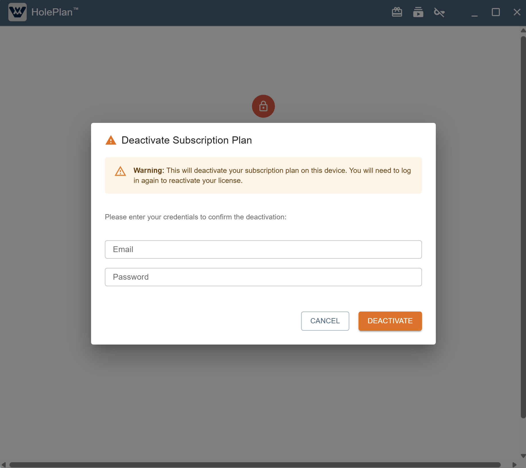 Deactivation: To remove the application from your current workstation, navigate to the "Deactivate" button. You will be prompted to confirm this action using your initial credentials (email and password). This process safely clears the HolePlan application from your computer.