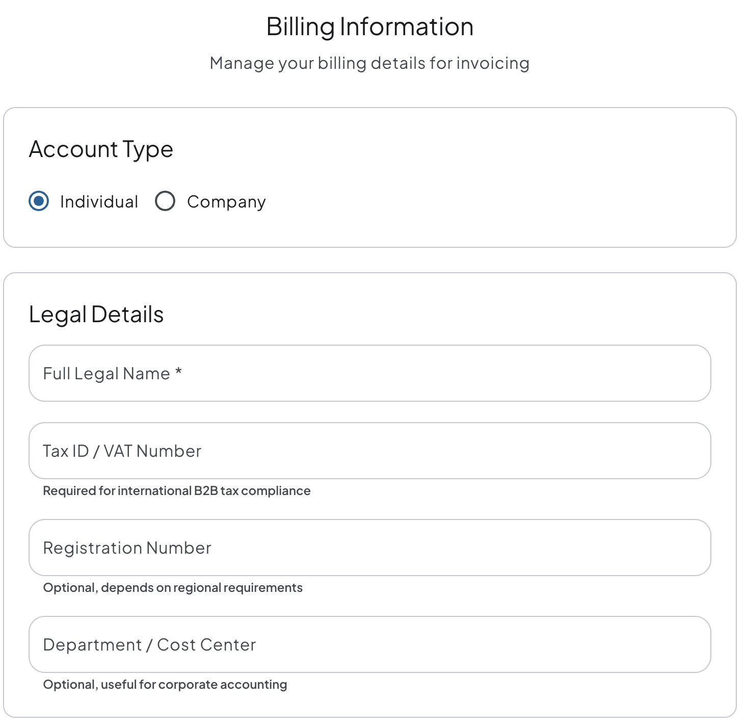 Why this matters: Completing this profile is a mandatory step. It ensures your account is properly verified and allows our system to seamlessly generate and issue accurate invoices when you are ready to request a professional subscription.
